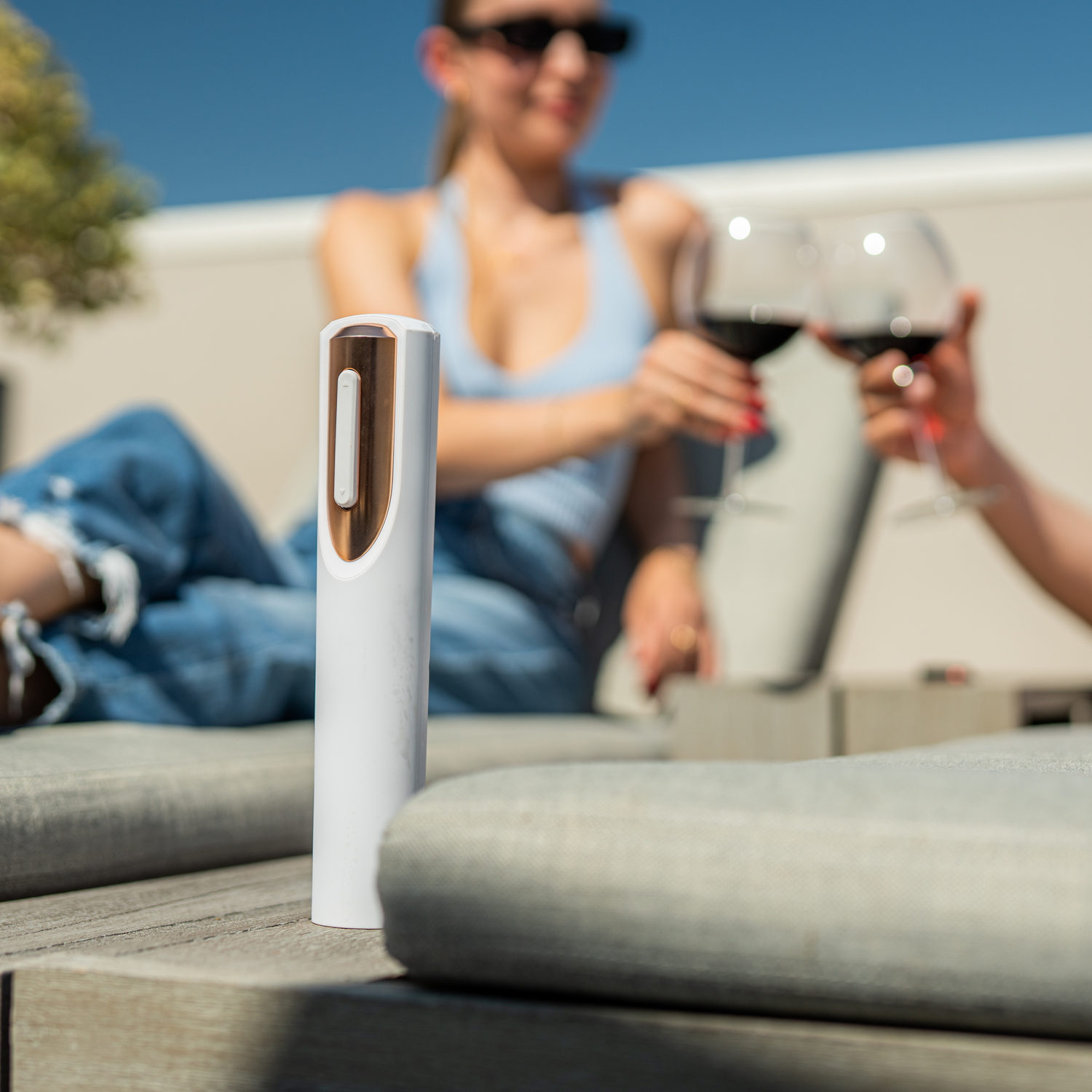 No outlet? No problem. The Battery Powered model runs on standard AA batteries (included), making it the ultimate travel companion for picnics, camping trips, or outdoor dining. It includes a smart base that doubles as a foil cutter.