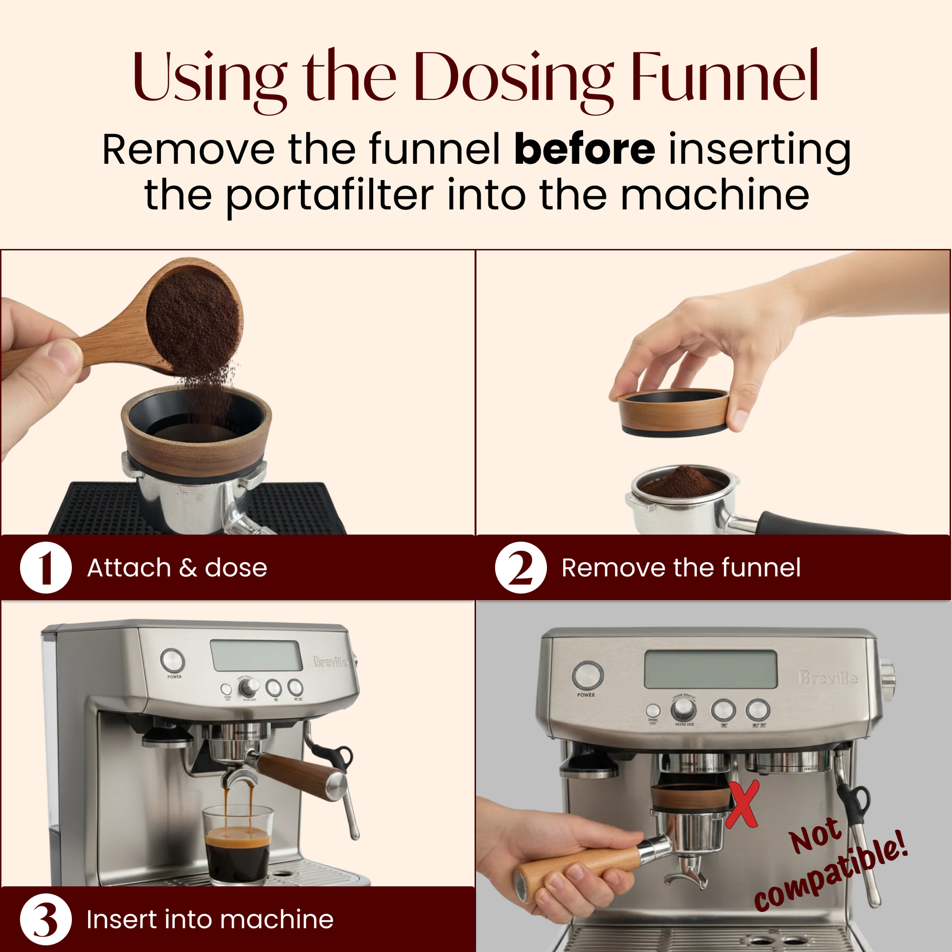 ✅ Compatible with 54mm Portafilters – Works with Breville, DeLonghi, Ninja, and other 54mm portafilters. Remove funnel before use on machine.