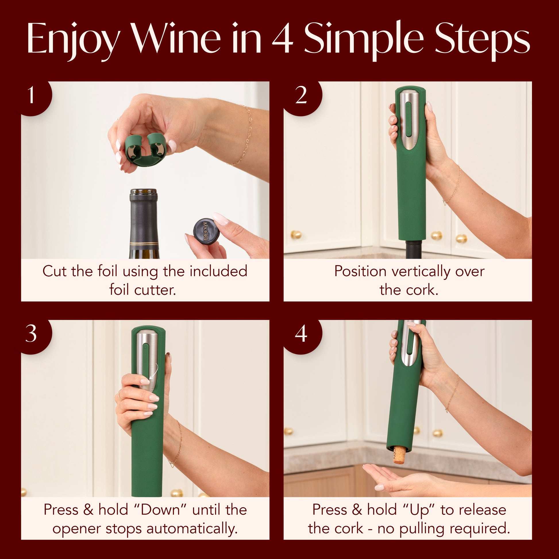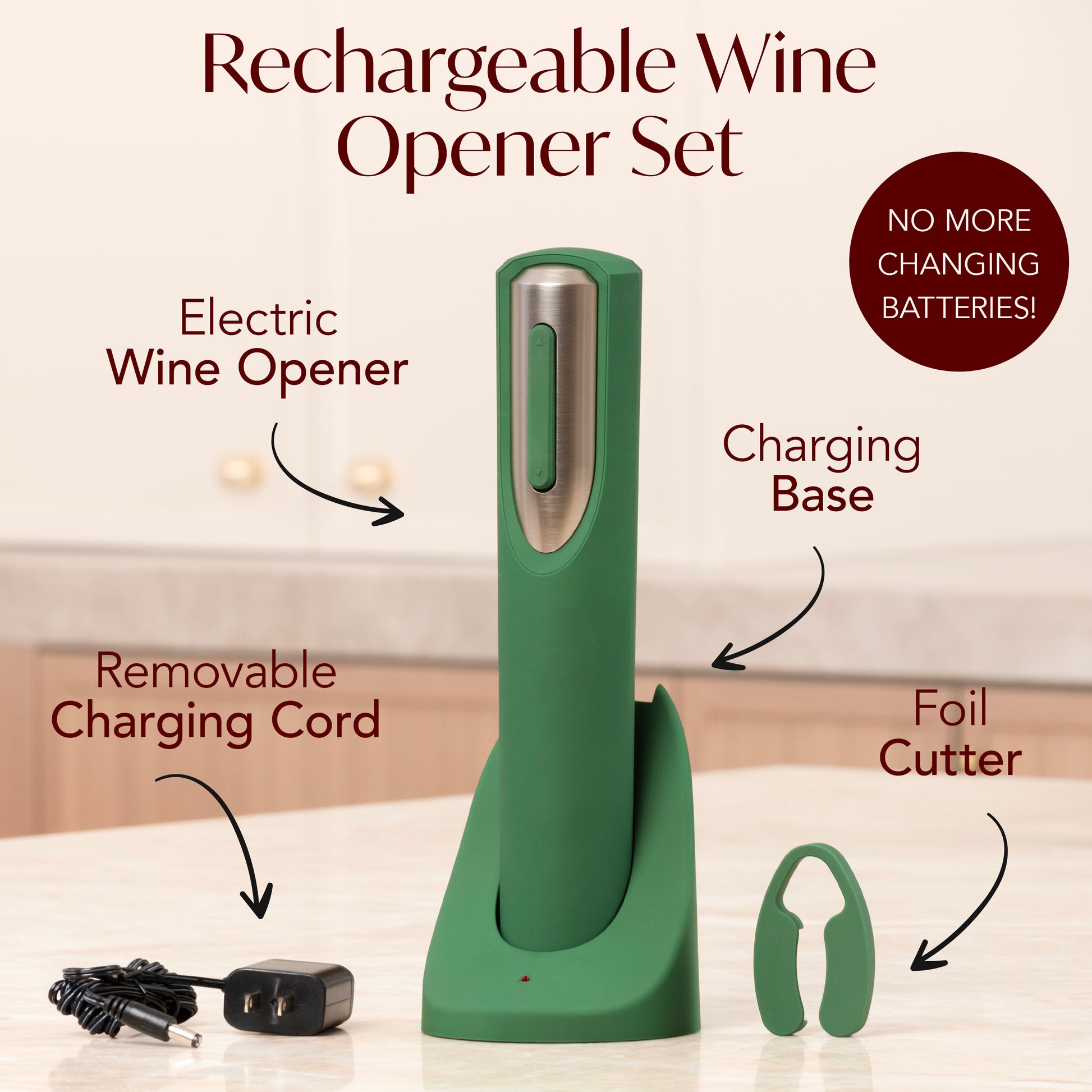 Enjoy your wine quicker with our well-designed electric wine opener. Includes a wine opener and foil cutter.